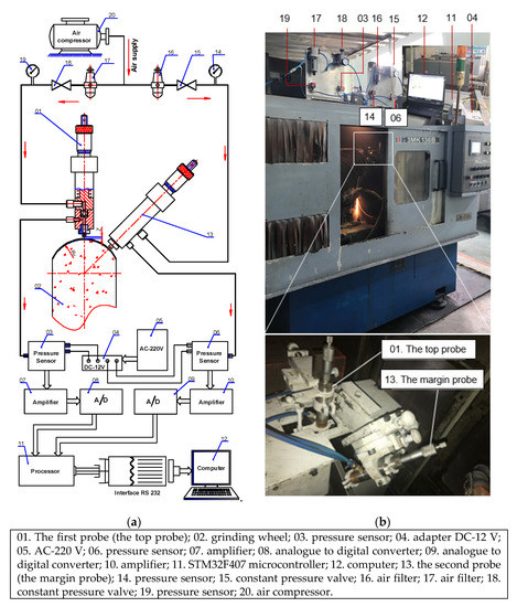 In this study, the wear value of the grinding wheel was measured by the measuring system consisting of two pneumatic probes, as shown in Figure 4. Two pneumatic probes were positioned at two different locations with the largest gap in the wear value on the curving edge surface of the grinding wheel. One measuring probe was mounted on the top of the curving edge surface and another at the margin of the curving edge surface of the profile grindstone on the 3MK136B grinder. Measuring the wear value of grindstone is an important part of this grinding process to determine the suitable dressing time. The wear can be determined by different measurement principles proposed in specific studies [18,19,20,21,22,23,24]. Some of them are based on capacitive [18] and acoustic emission principles [19]. Another method is based on the use of a CCD camera [20,21,22]. However, in addition to their high cost, those measurement methods have proved effective in library conditions but not for online measurement applications of precision grinding because of the negative influence of the grinding lubricant and the machining debris as well as eccentricity in wet grinding. Therefore, the pneumatic probes were used to measure the wear value of the grinding wheel in the study. This method allows online wear measurement in wet grinding condition and can overcome the difficulties of the mentioned methods [23,24]. In addition, this method provides some advantages including a simple design of the gauge, cost-effective maintenance, as well as an easy adjusting sensitivity and measuring range. Thus, grindstone wear in this study was measured by our measuring system consisting of two pneumatic probes (made in Vietnam). The top pneumatic probe has a measurement range of 200 μm with an accuracy of 1 μm, whereas the margin pneumatic probe has a measurement range of 140 μm with an accuracy of 1 μm [23]. The design of the probes as well as the solution for signals acquisition and processing in these probes are presented in [23].
