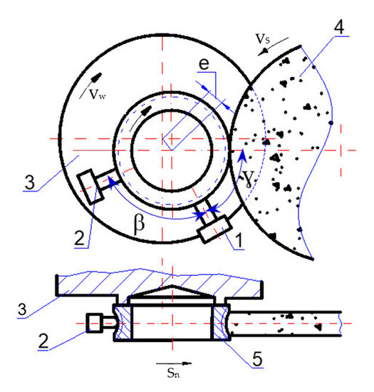The principal scheme of the shoe-type centerless grinding process for bearings’ inner ring raceway. 1, 2: Ring supports; 3: electromagnetic fixture; 4: grinding wheel; 5: grinding workpiece.