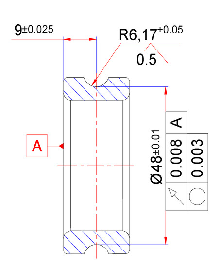 To process the raceway surface, it requires not only dimensional accuracy for the raceway bottom’s diameter, the raceway’s radius, and distance from the raceway central line to the head surface but also the accuracy for correlative positions including the oval level of the raceway bottom’s diameter and the circular run-out of the raceway central line in comparison to the head surface. In particular, the surface roughness of the raceway must be smaller than 0.5 µm (Ra < 0.5 µm), and the oval level of the raceway bottom’s diameter must be smaller than 3 µm (Op < 3 µm) [25]. These technical requirements of the finish grinding operation for the 6208_ball bearing’s inner ring raceway with precision level P06 are shown as Figure 7. However, the experimental data also showed that, with different values of the input parameters in the setting ranges, the quality requirements of the dimension deviation of the groove diameter, the dimension deviation of the distance from the groove’s center line to head surface, the dimension deviation of the groove radius, and the circular run-out of the groove central line to the head surface were still satisfied [15]. It can be explained that, for example, the dimension deviation of the distance from the groove’s center line to the head surface depends mainly on the fixing position of the workpiece but insignificantly on the input setting parameters. Thus, in that sense, only the dependencies of the performance factors, which were the grindstone’s wear, the part’s oval level, and the part’s surface roughness on input setting factors, which included the normal feed rate of fine grinding (Snf), the workpiece speed (Vw), the depth of fine grinding (af), and the number of ground parts (Np), were taken into account.