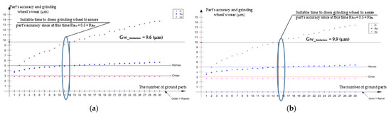 - For a certain set of process parameters, when the number of ground parts increased, the wear of the grinding wheel and the surface roughness of the raceway also increased, but the oval level of the raceway bottom’s diameter did not change. Therefore, according to grinding time, there is a moment at which the accuracy of the ground part will exceed the required accuracy. For the first set of process parameters, when the 12th part was ground, its surface roughness of the raceway was equal to the required surface roughness value (Ra12 = Rare = 0.5 μm). For this reason, from the 12th part upward, the surface roughness was not guaranteed as the requirement. This was the appropriate time to dress the grinding wheel. Thus, the wear value at the 12th part is the economic limitation wear value of the grinding wheel corresponding to the above cutting mode. Therefore, for the first set of process parameters, the economic limitation wear value was equal to the wear value at the 12th part, i.e., Gw_limitaiton = Gw12 = 9.6 μm.