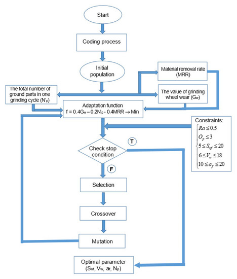 In this study, to solve the optimization problem with the constraints (23) and the objective function (25), a program applying the GA with the support of the MATLAB Global-Optimization Toolbox was developed. The algorithm diagram for the GA software program to solve the optimization problem of technology parameters in the centerless profile grinding operation for the inner ring groove’s surface of the 6208_ball bearing is illustrated in Figure 9.