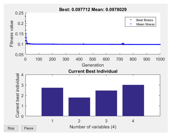 After running the program, the optimal solution was obtained, as shown in Table 8. Figure 10 illustrates the progress on which the program searched for the solution, running on the MATLAB environment.