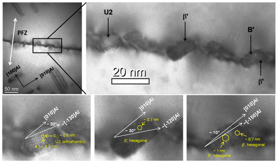 - Andersen, S.J.; Marioara, C.D.; Frøseth, A.; Vissers, R.; Zandbergen, H.W. Crystal structure of the orthorhombic U2-Al4Mg4Si4 precipitate in the AlMgSi alloy system and its relation to the β′ and β″ phases. Mater. Sci. Eng. A 2005, 390, 127–138. [Google Scholar] [CrossRef]