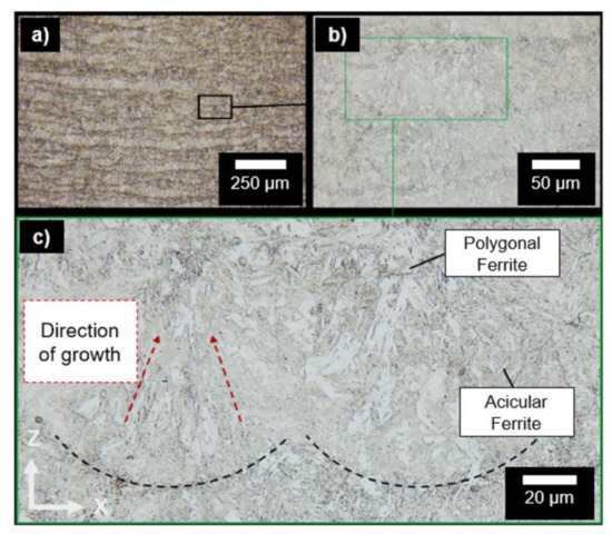 Parameters derived from earlier work that result in high part densities have been used to manufacture the specimens [6]. The horizontal and undulating weld tracks can be seen in Figure 1a. Following further magnification, the microstructure can be divided up into ferritic, bainitic and martensitic microstructure constituents. The ferritic structures can be split into polygonal and acicular ferrite. Polygonal ferrite, also called allotriomorphic ferrite, primarily forms at grain boundaries or inclusions through heterogeneous nucleation and has an amorphous shape with no crystallographic symmetry. In contrast, acicular ferrite is produced at very fast cooling speeds, such as those experienced in PBF-LB/M, and is characterized by an arbitrary arrangement of small, needle-shaped ferrite plates. Acicular ferrite is preferable since its toughness can delay crack propagation [42]. Moreover, the dark areas are identified as a bainitic-martensitic mixed structure. Possible melt pool boundaries are marked in Figure 1c, showing a directed solidification in build direction (z-direction). Relatively small grain sizes can be seen in the proximity of the melt pool boundaries, whereas the more distant grains show an increased grain size, which may be attributed to different temperature gradients during the cooling phase.