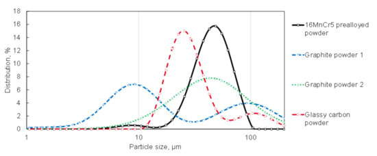 None of the carbon-carrying powders have clear borders at the higher end of the distribution. They all contain large particles with sizes above 120 µm. A large share of fine particles is preferred for a homogenous distribution of the carbon particles in the 16MnCr5 powder.