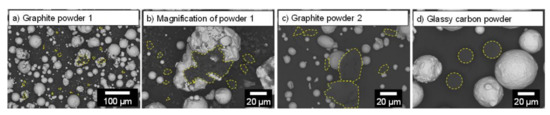 The resulting powder mixtures are depicted in Figure 3, showing that the particles from graphite powder 2 are equal to or larger than the particles of the 16MnCr5 powder. The glassy carbon powder particles are significantly smaller and can mix well with nearly twice as large 16MnCr5 particles. Graphite powder 1 has the smallest particles, which are non-spherical but possess the ability to adhere to the 16MnCr5 particles, as can be seen in the magnification in Figure 3b.
