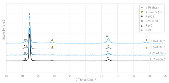 In addition, fine structures can be found which correspond to bainite and possibly lancet martensite. Plate martensite can be detected for the first time as of 0.5 wt.% C, whereas ferritic components are now absent. Very low amounts of retained austenite are visible in the metallographic cross-sections. At 0.8 wt.% carbon content, an increasing amount of plate martensite is formed with a low retained austenite content. X-ray crystallography experiments on the specimens show the occurrence of a face-centred cubic phase above a carbon content of 0.5 wt.% (c.f. Figure 6). By applying the Rietvield-methode the retained austenite content can be estimated with 10% at 0.8 wt.% C. The emerging retained austenite content is comparable with the literature from case-hardened 16MnCr5 [43].