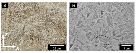 In addition to the X-ray diffraction, images of the specimen with 0.8 wt.% carbon taken by light microscope and SEM are presented in Figure 7. The images confirm the previous findings by revealing retained austenite and a mainly martensitic structure. The SEM image provides evidence in presenting the formed carbides that were formed during the PBF-LB/M process.