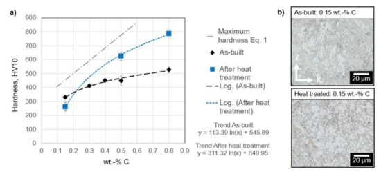 Furthermore, these hardness values differ significantly from the maximum achievable hardness, which can be calculated using Equation (1). Subsequently, heat treatment is carried out at the case hardening temperature of 16MnCr5 with quenching (heating at 870 °C for 50 minutes with subsequent oil quenching). The hardness values for higher carbon contents increase significantly whereas the hardness of the low carbon content decreases even further from 330 HV10 to 261 HV10 (−21%). A higher ferrite content and a different ferrite morphology can be observed in the microscope images in part b) of Figure 8 for the 0.15 wt.% carbon state after heat treatment. Martensitic fractions do not occur here because of the comparatively low cooling rates and low carbon content. In addition to the higher ferrite content, the microstructure after heat treatment is much more coarse. The changed morphology, as well as the more coarse microstructure, are possible causes for the decrease in hardness. The hardness increases from 450 to 620 HV10 (+37%) at 0.5 wt.% and changes from 527 to 786 HV10 (+49%) at 0.8 wt.%. A regression fit (coefficient of determination R2 = 0.99) is achieved by a logarithmic approximation. After heat treatment, the maximum nominal hardness (c.f. Equation (1)) is almost reached in the 0.3 to 0.5 wt.% carbon content range. The intersection of the two logarithmic regressions is located at a carbon content of 0.215 wt.% and a hardness of around 370 HV10.