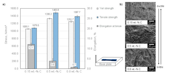 The hardness and the microstructure give a good impression of the nature of the resulting material. Nevertheless, the state of residual stress or the ductility are vital properties and the tensile tests that are performed offer more insights into the material. The specimens were printed in a horizontal position facing downwards, as indicated in Figure 9, and the samples were tested in the as-built state. The specimens show a plastic deformation and necking at 0.15 wt.% C. The tensile and yield strength are very close together and an ideal elastic-plastic behaviour can be observed. The corresponding fracture surface in Figure 9b show microscopically recognizable honeycombs which are typical for a ductile fracture. The samples with 0.5 wt.% carbon content showed the highest tensile strength of 1438 N/mm2 and a yield strength of 1330 N/mm2. The analysis of the fracture surface reveals a mixed fracture surface with fracture honeycombs and transcrystalline fracture surfaces. A further increase in carbon content leads to a decrease in strength and ductility. The samples break without necking and the fracture surfaces show typical signs of transcrystalline fractures. With an increasing carbon content, the elongation at fracture decreases steadily. In contrast, the strength is highest at 0.5 wt.% C and decreases at 0.8 wt.% C. In a trade-off between strength and ductility, the samples produced with 0.5 wt.% C possess the highest strength while maintaining medium ductility.