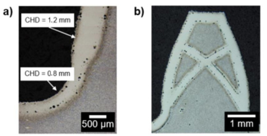 The possibility of quickly altering the steel composition by adding carbon opens up new opportunities in the development of alloys for additive manufacturing and could shorten development cycle times and reduce costs. Furthermore, new possibilities arise when considering multi-material processing in additive manufacturing. Materials with high carbon content and increased hardness can be used in wear-affected zones, whereas the nominal material can be used in the remaining part for good dynamic and ductile fatigue properties. No additional carburization process would be required for case hardening steels if carbon-enriched powders could be deposited during the PBF-LB/M process. The freedom offered by PBF-LB/M means that parts with varying case hardening depth (c.f. Figure 10; pores originating from faulty contour scan) are possible or even structures with high intrinsic strength. In addition, the use of lattice structures or minimum surface areas bodies, e.g., gyroids is possible. Global case hardening of such structures would lead to an embrittlement and weaken the part’s overall integrity. Combined with the design approach of ultralight components by replicating lattice structures in different sizes and order of magnitude, highly optimized and extreme lightweight parts for demanding applications like energy or aerospace could be produced [48].