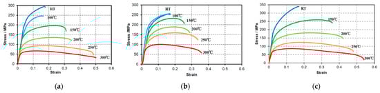 Stress-strain curves of AZ31 and AZ61 at different temperatures and initial strain rates. (a) AZ31B initial strain rate: 0.001 s−1; (b) AZ31B, 0.1 s−1; (c) AZ61, 0.01 s−1.