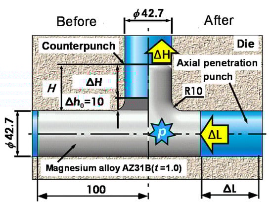 Manabe et al. [25,26] investigated the effect of enhancing the hydroforming limit and improving the wall thickness distribution under a non-uniform temperature field by locally heating/cooling warm T-shape forming of an AZ31 magnesium alloy. However, even for the non-uniform temperature field in the previous report [25,26], the above technological issues were not solved enough yet and remain.