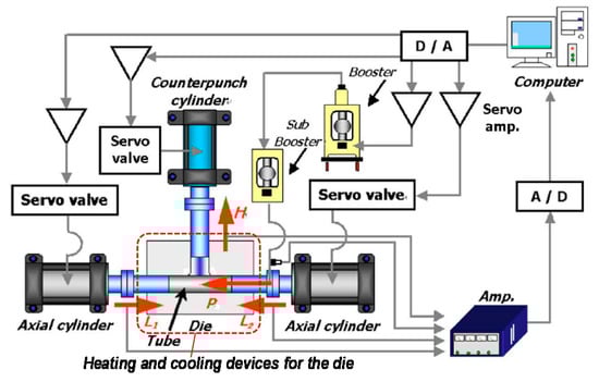 Figure 2 and Figure 3 show the schematic illustration of the T-shape forming tooling used in this study and the configuration of the hydraulic circuit and the closed loop control system for the T-shape WTHF process, respectively [2,3,4]. To conduct this experimental work, a new T-shape warm forming machine with a local heating/cooling apparatus for the die was developed. This machine is an improved version of the previously developed equipment [3,4], and it enables controlling the temperature distribution of the die as well. In this testing machine, each cylinder and pressure booster is operated by a command from a computer, and closed-loop control can be performed by sending the measured values of the axial punch displacement and internal pressure from moment to moment to the computer.
