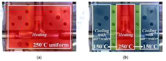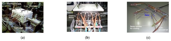 Figure 4 shows the appearance of the heating and cooling device. For heating and cooling the die, six through holes are opened for inserting cartridge heaters into the upper and lower dies, and heating for uniform temperature field (Figure 4a) can be performed with a total of 12 cartridge heaters with maximum total output of 11 kW. The forming die was fully covered with the insulator boards.
