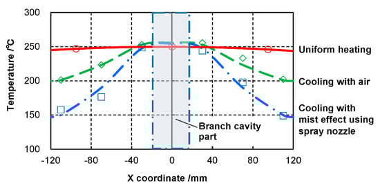 To create a non-uniform temperature field, after heating to 270 °C with all 12 heaters, only the total of eight heaters in the middle continued to be heated, and in the meantime, the cooling devices were attached to the four holes at both ends of the die. After about 30 min, the temperature field became stable. Since the die temperature uniformly shifted down about around 15 °C during the total forming time of about 5 min, the forming experiment started when the temperature at the center reached at around 260 °C to realize the set temperature distribution in the middle of forming process.
