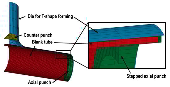 Finite element (FE) analysis is performed by a thermal-structural coupled dynamic explicit FE commercial code, LS-DYNA ver. 971. (Ansys Inc., Canonsburg, PA, USA). Using a quarter-symmetrical model for T-shape and a one-eighth model for the cross-shape, the tubular blank was divided into two in the wall thickness direction, 60 in the circumferential direction, and 100 in the axial direction. Figure 6 shows the FE model for warm T-shape hydroforming. The material properties obtained from the tensile test in Section 2.1 were employed in the FE analysis. Other input values are the density ρ = 1.78 g/cm3, Poisson’s ratio ν = 0.35, linear expansion coefficient α = 26.5 × 10−6/K, and specific heat c = 1.05 kJ/kgK.