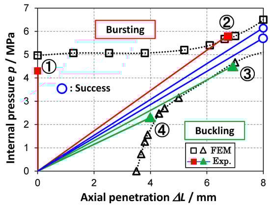 In order to clarify the process window in warm T-shape forming of AZ31B magnesium alloy and the FE modeling validation, WTHF experiments and FE analysis were performed in a proportional loading path under a uniform temperature field. Figure 7 shows the process window for T-shape forming for AZ31B under 250 °C obtained by the experiment and FE analysis. The onset point of “bursting” in the FE analysis was determined as when the wall thickness reduction began to increase rapidly without using any fracture criterion, or when the analysis was stopped. On the other hand, the occurrence of buckling was visually evaluated by visually displaying the deformed shape of the blank tube using the graphic processing of the post processor. It is confirmed that the bursting is predominant under higher internal pressure loading, the buckling is dominant when the axial penetration is predominant, and the successful region between both becomes narrow as the process proceeds.