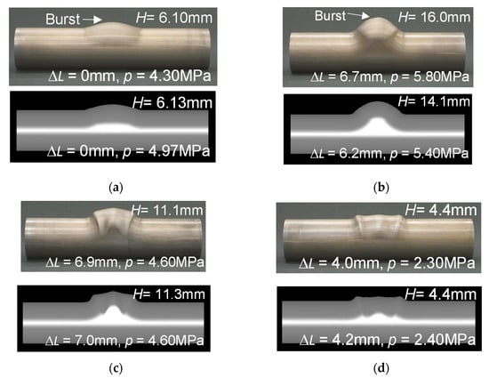 Figure 8 shows the comparisons of final bulged heights and their shapes at the forming limit between experimental results and FE simulation results in Figure 7. The failure modes in Figure 8a,b are both bursting, as shown in Figure 7, and their formed shapes and bulged heights are in good agreement. Figure 8c,d show different buckling modes, both of which are in good agreement with the experimental and FE analysis results in a uniform temperature field at 250 °C. The results confirmed the validity of this FE model and demonstrated the importance of loading path design using FE analysis.