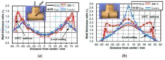 Figure 20 shows the optimum temperature distribution for T-shape forming of AZ61 and for cross-shape forming of both magnesium alloy tubes. For T-shape forming of AZ61 in Figure 20a, the optimum temperature distribution is different from that of AZ31B in Figure 18. The bottom temperature for AZ61 is 150 °C and 20 °C higher than that of AZ31B. On the other hand, for cross-shape forming shown in Figure 20b, in the cross-shape forming of AZ31B and AZ61, the optimum temperature distribution was the same. It was shown that the die was 250 °C and the counter punch was 200 °C, and for the temperature distribution cooling, only the bulge head was sufficient.