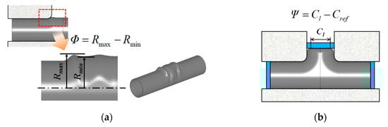 Evaluation functions for T-shape forming. (a) Evaluation function Φ for the risk of wavy buckling; (b) Evaluation function Ψ for the contact length with counter punch. Rmax: maximum bulged height (radius) near the die inlet shoulder part; Rmin: minimum bulged height (radius) near there; Cl: contact length with a counter punch; Cref: assumed reference contact length. A red rectangle indicates a maximum bulged part region near the die inlet.