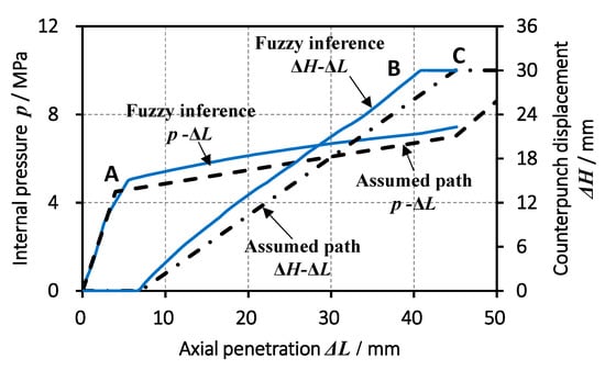 Comparison of loading path between the manual set from experience and the fuzzy inference model (250 °C), p: internal pressure, ∆H: counterpunch displacement, ∆L: axial penetration.
