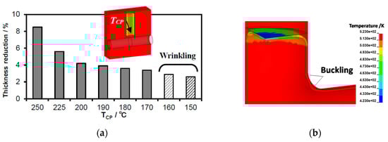 Effect of counter punch temperature TCP on wall thickness reduction at the center of counter punch. (a) Effect of TCP; (b) buckling occurred near the die shoulder.