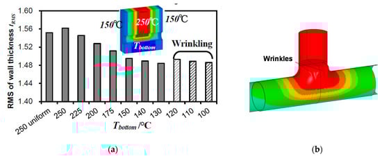Figure 16 shows the effect of the bottom center temperature Tbottom on the uniformity of the wall thickness distribution. In this figure, a comparison based on the tRMS is performed. It can be seen that the uniformity of the wall thickness distribution is improved by decreasing the Tbottom. On the other hand, the buckling shown in Figure 16b was confirmed in the bulging part when the temperature of Tbottom was 120 °C or less, so it is possible that there is an appropriate temperature condition for Tbottom to make the wall thickness distribution uniform without causing forming defects. It is suggested that the optimum temperature of Tbottom in T-shape forming of AZ31B is 130 °C. By the way, the difference in the tRMS between the “250 uniform” and the Tbottom “250” in Figure 16 is caused by the temperature distribution of the die. When Tbottom = 250 °C, there is still a temperature distribution of the die in the axial direction of the tube, and the part where the temperature on the tube end side remains low. Due to the influence of the non-uniform temperature field, there is a difference in tRMS from the “250 uniform” for the uniform temperature field.