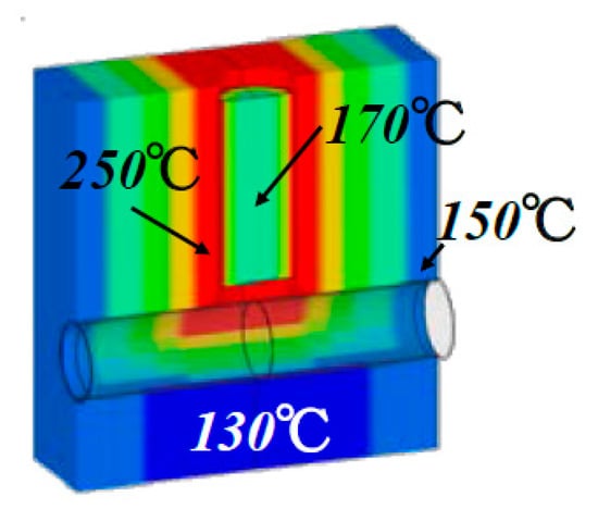 From the above results, by creating a complex non-uniform temperature field lowering not only the die temperature in the direction of the tube axis but also to 130 °C to the opposite bottom of the bulge branch, it is found that the wall thickness distribution of the entire T-shaped product is further improved compared to under the uniform temperature field. For the T-shape forming of AZ31B, the optimized temperature conditions for the uniformity of the wall thickness of the formed product may be as shown in Figure 17.
