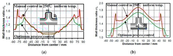 Comparison of wall thickness distribution between manual control and optimum process control (FE analysis). (a) Bulge side; (b) bottom side.