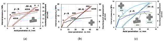 By the way, the effects of T-shape forming and cross-forming on the p-∆L curves, which have different forming shapes, can be clearly seen from the result of AZ61 in Figure 19c, which expresses the vertical axis on the same scale. At the early stage of forming process, there is a slight difference in the p-∆L curve between the two, but there is a slight difference in the p value at point A. It can be seen that the increase in the p is large for the cross-shape forming, and it requires nearly 1.8 as much as in the latter half of T-shape forming. Meanwhile, the ∆H-∆L curve does not differ depending on the forming shape.