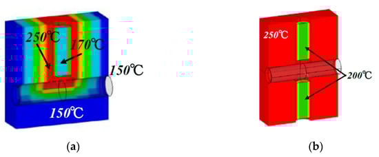 Temperature distribution conditions in warm T-shape forming process for AZ31B. (a) Uniform temperature field at 250 °C; (b) Non-uniform temperature field.