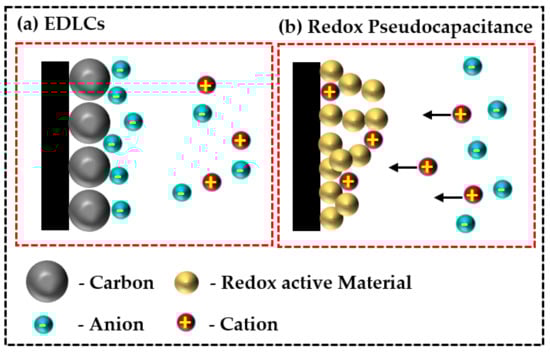 Schematic illustration of (a) electric double layer supercapacitors (EDLCs) and (b) redox pseudocapacitors.
