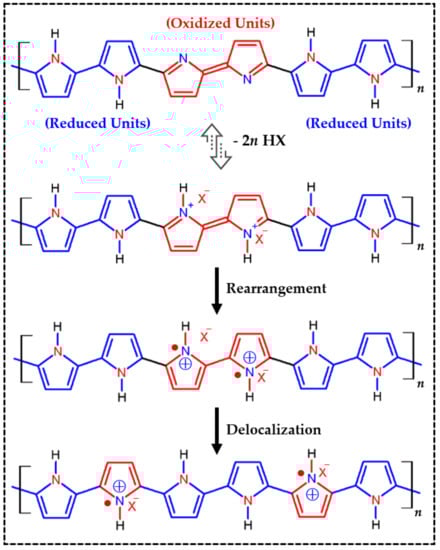 Deprotonation reaction of conducting PPy salt under alkaline conditions and rearrangement of electrons in PPy, generation of bipolarons/polarons by delocalization over PPy chain. Note: HX = arbitrary acid, X− = corresponding counter ion, polarons = acts as charge carriers.