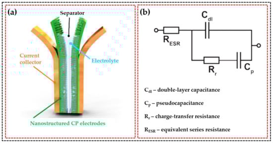 Concerning device construction strategies, both batteries and electrochemical capacitors follow similar prototypes but differ in energy storage mechanisms and applications. In brief, an electrical insulator (separator) often separates two electrodes (current collectors). The design strategy for electrolytic capacitors is usually represented as parallel plate capacitors; dielectric materials often separate the electrodes. The energy storage capability is because of polarization in the existence of an external electric field. Since the energy storage mechanism of electrochemical capacitors is in the capacitor of the electric double layer (an interface between an electrode and an aqueous/non-aqueous electrolyte), the capacitance and energy density of these devices are compatibly larger than electrolytic capacitors. Although electrolytic capacitors have larger cycling efficacy, they suffer from low energy density. Hence, nanostructured CP electrodes with high surface area exhibiting a pronounced pseudocapacitance behavior are widely used to construct electrochemical capacitors [19,20,21]. Along with metal-organic frameworks (metal oxides/phosphides/sulfides), these nanostructured CPs display synergistic interaction, resulting in contributing superior supercapacitive properties. Figure 3 represents the device prototype of an electrochemical capacitor made of a CP electrode and its equivalent circuit illustration. Bryan et al. [22] recently briefly outlined the construction of electrochemical capacitors from various CPs and their device engineering strategies. The authors predominantly emphasized the pseudocapacitive performance of PPy with synthetic chemical doping strategies [22].