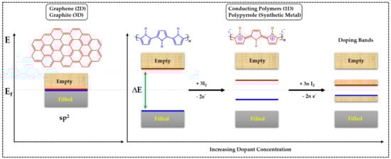 Compared to EDLCs, ion transport in pseudocapacitors is indolent because of faradaic processes. Since CPs possess high electrochemical capacitance and conductivity, it must facilitate facile kinetics, charge carriers, charge mobility, and accessible counterions. By chemical reduction process (n-doping), the insertion of electrons to the conduction band will be carried out. Removal of electrons from the valence band was done by oxidation process (p-doping), which eventually upsurge the concentration of charge carriers [23,24]. Consider the ionization of CPs, there will be a difference in the equilibrium geometry of the ionized state and its respective ground state. The ionized state of CPs possesses lower equilibrium geometry than its ground state. This lattice distortion causes the highest occupied molecular orbital (HOMO) to swing upwards, and the lowest unoccupied molecular orbital (LUMO) shifts downwards, forming new energy bands in the bandgap. These newly created energy bands are delocalized over the polymer chain, results in the creation of a charge “island.” When the polymer chain is chemically doped, it results in ionization of polymer chains, and the overlapping and delocalization of these islands facilitates the conducting behavior of the polymers [25,26]. Since the conjugated sp2 carbons are the key frameworks of CPs, the semi-metallic properties of CPs resemble the conductivities of 2D graphene or 3D graphite materials. Conversely, a Jahn−Teller-like relaxation (or Peierls transition) will ensure the separation among unfilled and filled portions of the sp2 band. When graphene is chemically doped, it will also exhibit a bandgap. In contrast to graphene electronic conductivity, to demonstrate increased electronic conductivity in the case of CPs, new energy levels are essential, and they must be added to the gap via doping (see Figure 4 for a schematic illustration). The charge island formation in the case of CPs (especially PPy) is a more divergent doping technique than that of conventional semiconductors [18,27,28]. Over the past few decades, the research works on metal-organic frameworks (MOFs) have gained increased importance in conventional gas separation and storage, catalysis, electrochemical sensors, and rechargeable batteries due to their unique surface characteristics, tunable porosities, and electrochemical properties. However, the application of MOFs in supercapacitor’s electronic components is diminutive because of its high electrical resistivity. To fix this issue, decorating MOFs with a well-known conductive polymer, PPy (prevalently knows as “synthetic metal”), can contribute favorable solicitations in the construction of electrochemical energy storage devices [29,30,31,32,33].