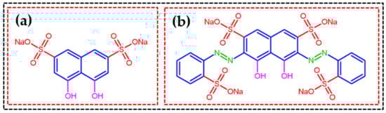 The chemical structures of (a) chromotropic acid (CHR) disodium salt and (b) 2,7-Bis(2-sulfophenylazo)chromotropic acid tetrasodium salt (CHR-BS).