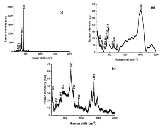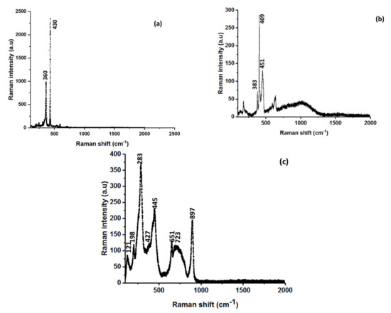 (a) Raman spectra of WS2; (b) Raman spectra of MoS2 (383, 409 cm−1) (Mo1); (c) Raman spectra of PT.