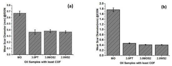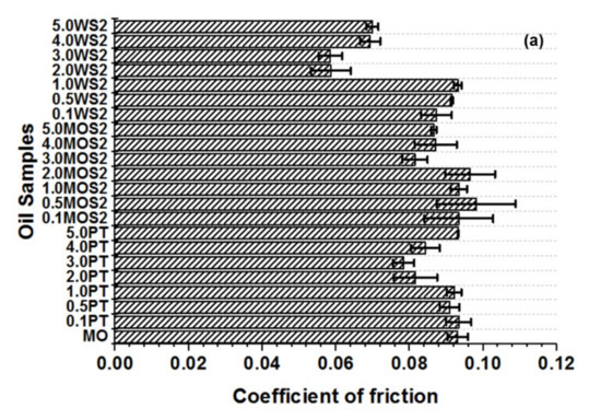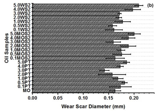 The anti-wear tests were conducted according to the ASTM 4172 standards. Each test was repeated thrice in identical testing conditions. The wear scar diameters of the lower stationary balls were measured using the WINDUCOM image acquisition system (Make: DUCOM, Bengaluru, India). Figure 3 shows the average coefficient of friction (CoF) and the wear scar diameter (WSD). From Figure 3a it was observed that the CoF of some of the additivated oil samples was less than MO, while some of them exhibited a higher CoF than MO. The samples containing 3% PT, 3% MoS2, and 2% WS2 exhibited less CoF than MO. Among all the oil samples, 2% WS2 exhibited the least CoF, followed by 3% PT and 3% MoS2. The CoF of 2% WS2 was about 37% less than MO, while CoF exhibited by 3% PT and 3% MoS2 was 15.7% and 12.5% less than MO. Additionally, it was seen that 2% WS2 exhibited 28% and 25% less CoF than 3% MoS2 and 2% PT, respectively.