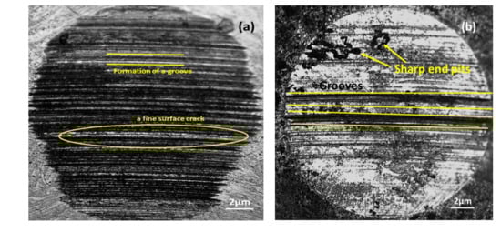 Regarding the wear modes of the AISI 52100 balls subjected to the anti-wear tests, it can be observed that there are many surface cracks and pits obtained for the non-additivated mineral oil (Figure 8a,b). For the MO + 2% WS2 samples (Figure 8c,d), only numerous pits can be observed, the additive hindering the formation of cracks due to the reason previously presented—the presence of lamellar additive between the mating surfaces. The brittle structure of MoS2, which also possesses a layered structure in which the stacked monolayers are held together by weak van der Waals interactions, conducted to the formation of both pits and micro-cracks as—from place to place—direct contact between the metals occurred (Figure 8e,f). The most protective action against wear is reported for the MO + 3% PT, the layered structure of PT, composed by flakes and sheet-like shapes, being more resistant to shearing in tribological contacts (Figure 8g,h).