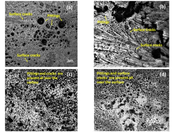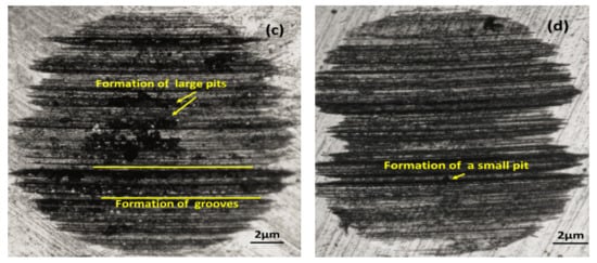 The wear scar diameter exhibited by the oil samples is shown in Figure 3b. It was seen that 3% PT exhibited the lowest WSD among all the oil samples. The WSD in case of 3% PT was about 12% less than MO. An amount of 0.1% MoS2 showed the least WSD among the samples containing MoS2 and 0.5% WS2 showed the least WSD among the samples containing WS2, but the WSD of MO without any additives was less than the WSDs of both 0.1% MoS2 and 0.5% WS2. The WSD of 3% PT was 12% and 10% less than of 0.1% MoS2 and 0.5% WS2-dispersed samples, respectively. Figure 4 shows images of the wear scars of the lower balls in the presence of various lubricants. Grooves and fine cracks were observed on balls tested using MO without any additives (Figure 4a). Grooves and sharp edged pits were also formed on the balls where WS2 (Figure 4b) as well as MoS2 (Figure 4c) were used as additives; however, the surface of the balls in presence of PT-dispersed MO (Figure 4d) exhibited minimal surface damage. This aspect indicates that there is a stable fluid film in case of PT-dispersed MO, which prevented metal–metal interaction, resulting in relatively lesser damaged surfaces in PT-dispersed MO as compared to MO without additives, MO with WS2, and MoS2.