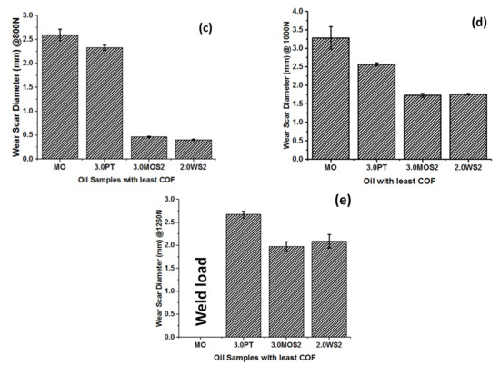 The extreme pressure properties of the oil samples with the least COF were analysed according to ASTM 2783. From Figure 5, it was seen that the WSD of the oil samples containing 3% PT, 3% MoS2 and 2% WS2 were almost the same at 500 N and 630 N, but at 800 N, 1000 N and 1260 N the WSD of PT-dispersed oil samples was slightly higher than of MOS2 and WS2 samples; however, MO-lubricated samples were welded at 1600 N, but it is to be noted that the additivated MO samples exhibited better EP properties than the base MO without additives. The WSD of MO was larger than all the additivated samples at all loads, indicating that the EP properties enhanced with the addition of PT, MoS2 and WS2. Further to that, MO reached its weld load at 1260 N but the additivated samples did not weld, which further formed a strong point of enhanced EP properties of MO in the presence of PT, MoS2 and WS2. In fact, in the case of Figure 5e, the wear scar for the MO is the highest, as the welding generated circular wear traces on the tested balls and engaged in circular movement, even the three stationary balls from the pot.