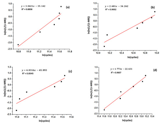 Weibull plots for (a) MO, (b) MO + PT, (c) MO + WS2 and (d) MO+ MoS2.
