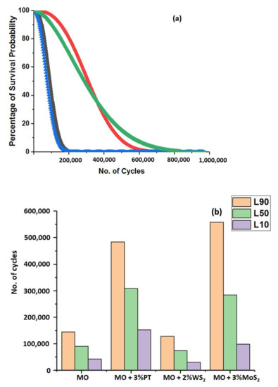 (a) Percentage of survival probability; (b) Life cycles in presence of lubricants with and without additives.
