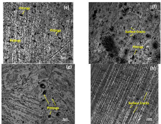 In order to understand the formation of tribo-film during the anti-wear tests, the wear tracks were further analysed by optical microscopy. The formation of a stable protective layer on the wear tracks is responsible for enhancing the tribological properties of the lubricant; thus, increasing the fatigue life of the mechanical component (steel balls). The applied load and shear of the lubricant due to the rolling action during the RCF tests generated high local stresses at the contact points. The presence of a stable film between the tribo-pairs would prevent the contact between the two bodies. Any wear or crack formation on the surface is the result of the cyclic stresses due to the repeated rolling contacts. From Section 3.1 and Section 3.2, it was seen that, even though the CoF in WS2 was lowest, the balls in the presence of MO and WS2-dispersed MO exhibited less RCF life than the balls in the presence of PT and MoS2-dispersed MO. The wear scar diameter of WS2-dispersed MO was larger than PT-dispersed MO and slightly higher than MoS2-dispersed MO, indicating the chances of film breakage on the steel surfaces. The breakage of film resulted in contact between the mating pairs, which initiated deep scratches, resulting in the formation of cracks. Figure 8 shows the optical microscope images of the balls after the RCF test. High amounts of pitting and surface cracks were observed on the ball surfaces where MO and WS2-dispersed MO was used, indicating high contact between the mating surfaces. However, the pitting and surface cracks on the balls were found to be less in case of MoS2 (Figure 8e,f) and PT-dispersed MO (Figure 8g,h), making a strong point of the presence of stable film in case of MoS2 and PT-dispersed MO as compared to MO (without additives) and WS2-dispersed MO. To the best of the knowledge of the authors, this observation of damaged surfaces during rolling contact fatigue has not been reported so far for the tested oil samples.