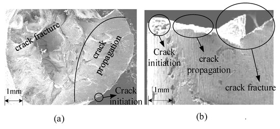 Figure 6. Corrosion fatigue fracture morphology. (a) Corrosion pit evolution diagram; (b) steel wire fracture diagram near corrosion pit.