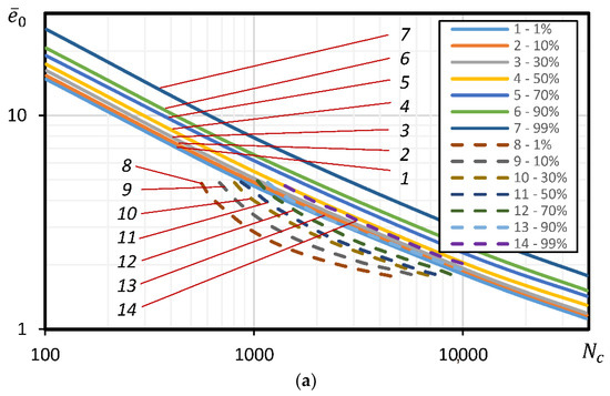 Using Equations (11), (13), and (14), low-cycle fatigue probability 1%, 10%, 30%, 50%, 70%, 90%, and 99% low-cycle durability curves were designed for steel 15Cr2MoVa, steel C45, and aluminium alloy D16T1 on the relative coordinates log–log Nc (Figure 9 and Figure 10). The relative values of plastic strain were obtained by dividing the absolute strain values by the proportional limit strain epr of the materials.