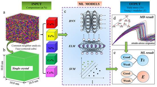 In this work, molecular dynamics (MD) simulation was combined with different ML methods to predict the mechanical properties of HEAs with changes in the elemental compositions. The schematic diagram is shown in Figure 1. Firstly, the mechanical responses of 900 single-crystal CuFeNiCrCo samples with different compositions (at.%) were obtained by MD simulations. Based on the MD results, a database was established to describe the relationship between element composition and mechanical properties of the tested HEA samples. Secondly, the overall dataset was divided into train, development (dev) and test sets. Eight ML models were investigated and compared for a binary classification task. The composition of the five elements was used to give a prediction on yield stress and elastic modulus of HEA. Finally, the large polycrystal CuFeNiCrCo samples with different compositions were constructed. The well-trained ML model, based on single-crystal samples, was used to predict the mechanical responses of the polycrystal samples. The prediction from the kernel-based extreme learning machine (KELM) model was in good agreement with the calculated results from the MD simulation. This contribution shows that computational study combined with ML methods is an efficient way to predict the mechanical properties of HEAs.
