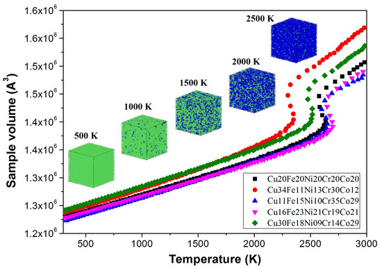 The phase stability of the simulation sample was further examined by gradually raising the system temperature. Before the heating process, the HEA sample was firstly relaxed to an equilibrium configuration at 300 K in the canonical ensemble NVT (constant atom number, constant box volume and constant temperature). Then, the temperature gradually increases from ambient temperature (300 K) to high temperature (3000 K) in the isothermal-isobaric ensemble (NPT). As shown in Figure 2, the HEA samples with different element compositions were tested, including an equiatomic sample and four non-equiatomic samples. The total volume of the system was monitored during the heating process. The inserted snapshots show the atomic configurations of the Cu30Fe18Ni9Cr14Co29 sample at different temperature levels. Atoms are coloured by common neighbour analysis (CNA) method, where the green atoms are in fcc structure, and the blue atoms represent a disordered structure. It was found that the fcc phase of the HEA sample has not changed below 1000 K. From 1500 to 2000 K, the disordered atoms (blue atoms) increased considerably. The first-order phase transition (solid to liquid) was observed at about 2500 K, where the sample volume shows a sudden jump. The other four simulated samples in Figure 2 show a similar process, although the melting temperature varies depending on the composition of the elements.