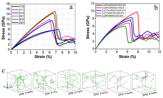 The mechanical responses of the equiatomic CuFeNiCrCo samples with different crystallographic orientations under uniaxial tension at 300 K are shown in Figure 3a. Young’s modulus for each orientation is obtained from the linear portion of its corresponding stress-strain between 0 and 0.5% strain. Theoretically, the nucleation of the first set of dislocations corresponds to the yield strength of materials [24]. Figure 3c shows the snapshots of the nucleation of the first set of dislocations in the single-crystal samples with different orientations. The dislocations are extracted by the dislocation extraction algorithm (DXA) algorithm [34], wherein the different colours represent different types of dislocations. By comparing the tensile strain, it was found that the dislocation nucleation event occurs near the peak of the stress-strain curve. Therefore, according to previous MD studies, the peak stress on the stress-strain curve is defined as the yield stress [35,36,37]. The mechanical response shows an elastic anisotropy of the HEA samples with different crystal orientations. The tension along [111] orientation shows the maximum Young’s modulus of 268.96 GPa, while the [210] orientation has the minimum value of 169.07 GPa. Additionally, there are remarkable differences in yield stress for different orientations; the maximum yield stress is 15.14 GPa for [111] orientation, and the minimum value is 7.66 GPa for [110] orientation. Therefore, considering the anisotropy of the mechanical properties of materials can contain a wider range of information than simply considering the element composition when establishing a database, which is conducive to improving the reliability and applicability of an ML model in dealing with complex structural materials.